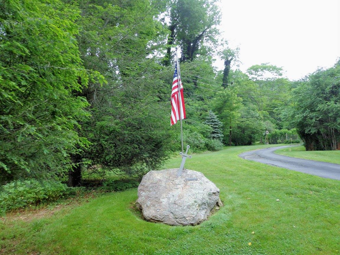 About halfway through the pleasant surroundings we came upon a yard of a house and down beneath it was a huge rock with a sword stuck into a stone with an American flag flying above it.